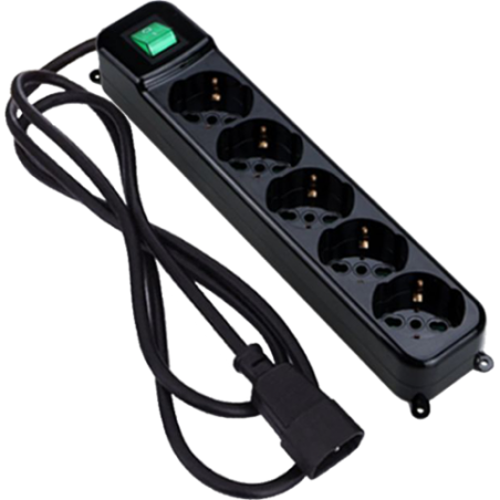 IEC C14 -liitännällä varustettu 5-paikkainen kuormakaapeli, joka mahdollistaa tavallisten suko-pistokkeiden kytkemisen UPS-varavirtalähteisiin, joissa on IEC-pistokkeet.